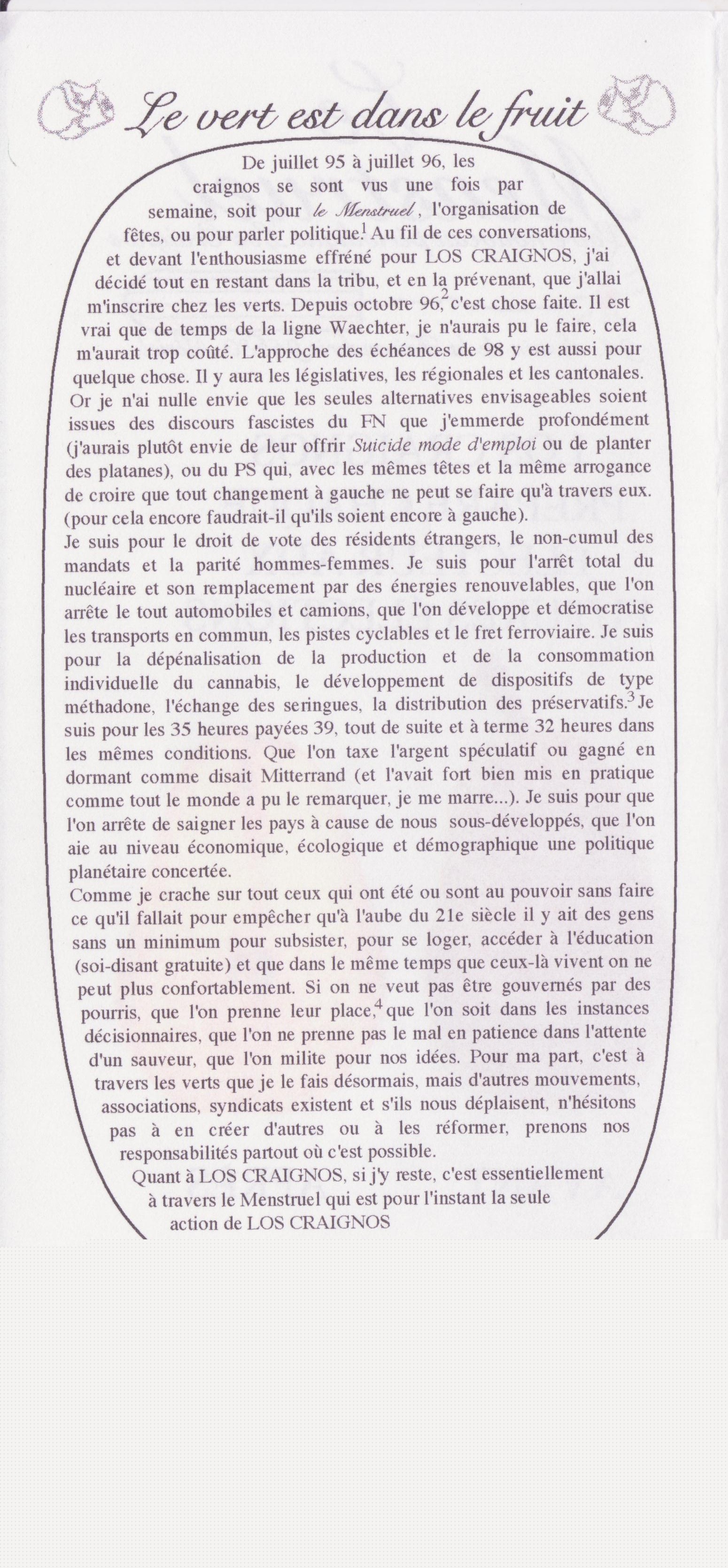 Je viens de retrouver dans mes cartons, l’article que j’avais écrit dans un petit fanzine "satirique", Le Menstruel - Votre nouveau périodique. C’était Los Craignos qui le réalisait, le diffusait.
