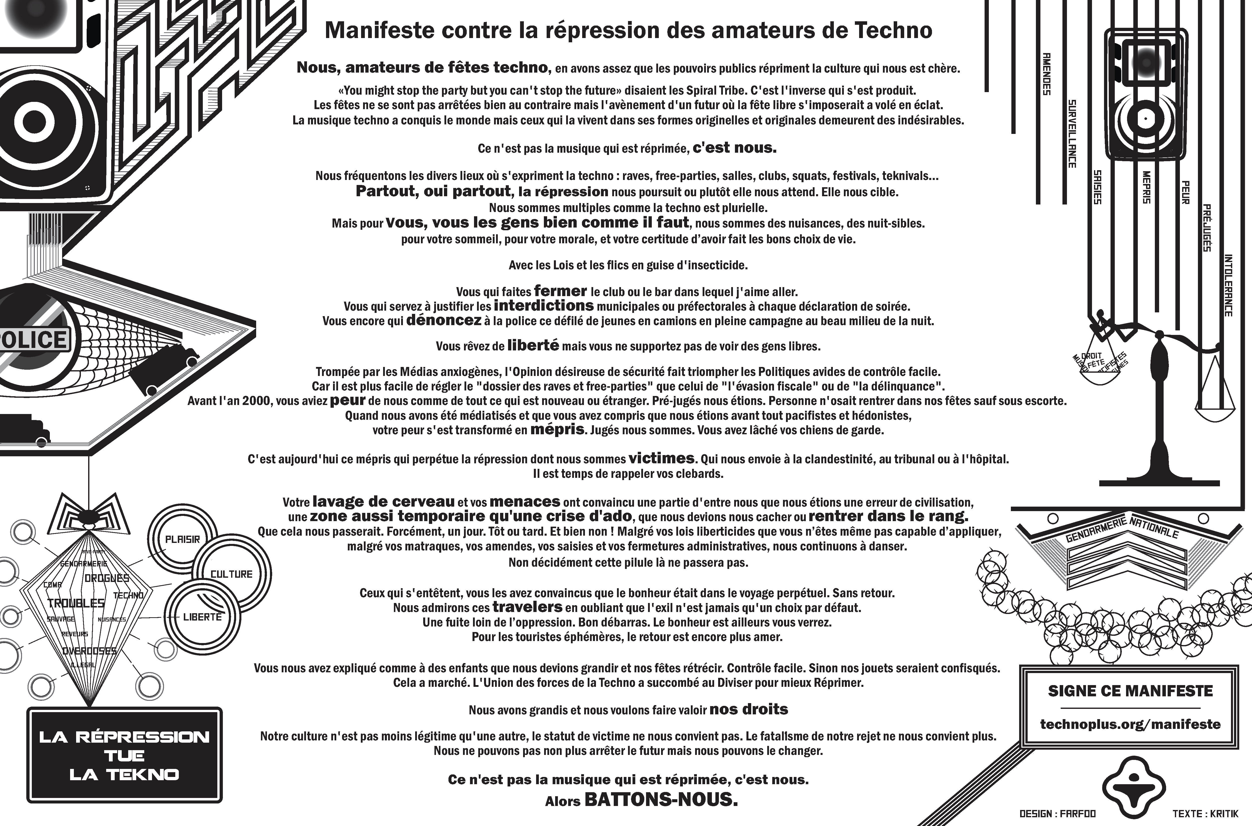 Manifeste contre la répression des amateurs de Techno samedi 31 janvier 2015, par Sylvain De Smet Voir en ligne : Cliquer ici pour accéder au site Techno+ pour ensuite signer le manifeste